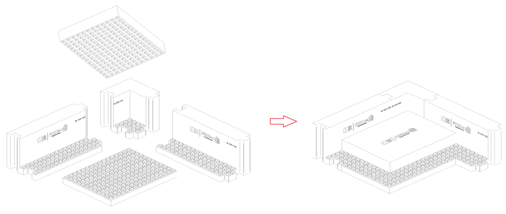 Vse ploskve vsakega elementa se stikajo čepasto ali po sistemu pero/utor, kar zagotavlja zvezno toplotno izolacijo oziroma odsotnost običajnih toplotnih mostov. Navodila za sestavljanje izdelamo za vsak objekt posebej in jih dodamo brezplačno. Ker je potek sestavljanja– po principu »lego kock« – enostaven in hiter, omogoča ob kakovostni izvedbi prihranek časa. Točen tovarniški prirez pa prihrani naročanje viškov materiala »za rezervo« ter okoljsko prijazno gradbišče brez odpadkov.