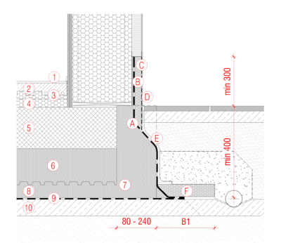 Robni element JUBHome BASE se geometrijsko prilagodi vertikalni ravnini hidroizolacije podzidka lesenih montažnih stenskih elementov tako, da zagotavlja neprekinjen ovoj s talno hidroizolacijo. Zaradi zagotavljanja blagih prehodov hidroizolacije se robni element oblikuje v nagibih. Prostor med vertikalno hidroizolacijo podzidka in fasadno ravnino se zapolni z JUBIZOL EPS F STRONG S0 Premium ploščami. Vertikalna hidroizolacija se izvede s samolepilno ali varjeno bitumensko hidroizolacijo.