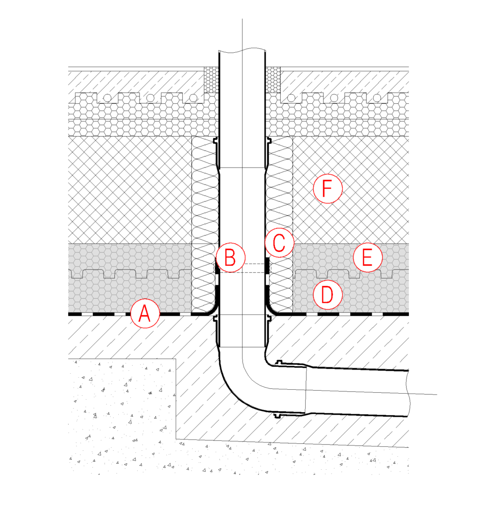 Pri izvedbi instalacijskih prebojev skozi ovoj stavbe moramo zagotoviti popolno zrakotesnost, vodotesnost ter toplotno izolativnost. S pasom mehke toplotne izolacije med cevjo in AB ploščo omogočimo varen horizontalni premik v primeru zelo velikih horizontalnih (npr. potresnih) obremenitev.