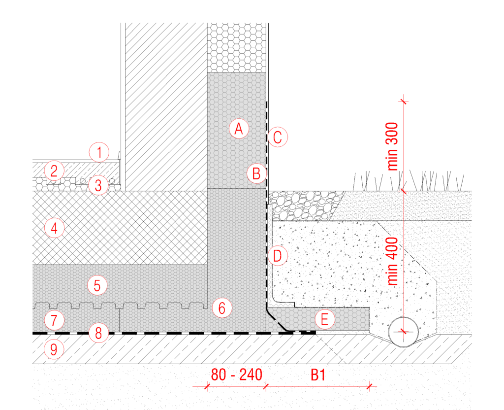 Robni element toplotne izolacije temeljne plošče JUBHOME BASE preide brez toplotnega mostu  neposredno v fasadni del stenskega elementa JUBHome WALL ter tako zagotavlja zvezni toplotnoizolacijski ovoj. Talna hidroizolacija je iz varjenih bitumenskih trakov in je spojena z varjeno ali  samolepilno vertikalno izolacijo podzidka.