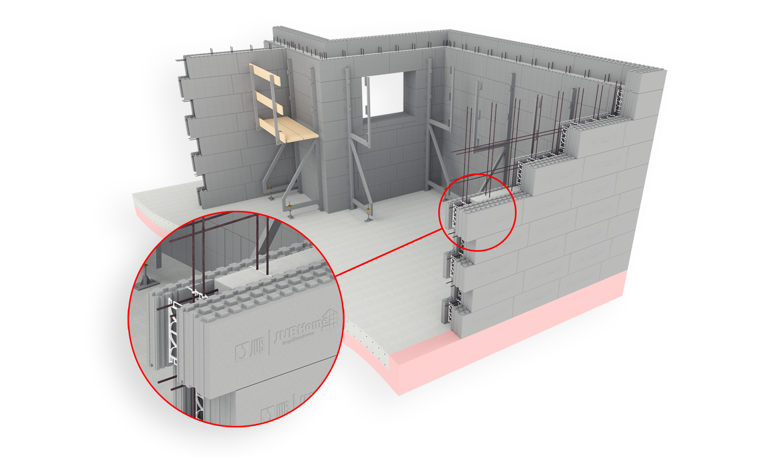 Sistem gradnje sten JUBHome WALL sestavlja več elementov različnih oblik in dimenzij izdelanih iz surovine Neopor® proizvajalca BASF. Elementi na gradbišče prispejo s sestavnim načrtom in točno ukrojeni na konkreten objekt, kar nam omogoča uporaba BIM** tehnologij. S pomočjo sestavnega načrta se posamezni elementi na gradbišču po principu »lego kock« zlahka sestavijo v celoto.